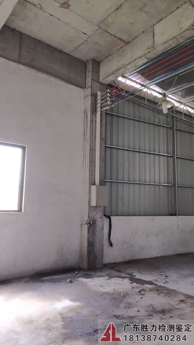 廣東省鶴山市某廠房建筑在房屋,據悉建于2016年,主要朝向為坐西向東,鋼筋混凝土框架結構四層,總建筑面積約5400m2,作廠房用途使用。房屋主體結構以現澆鋼筋混凝土柱、梁、板等構件承重,180mm厚磚墻間隔、圍護,內墻為混合砂漿抹灰,天花為素混凝土飾面,水泥地面,卷閘門、鋁合金窗。