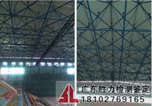該體育館主體結構采用鋼筋混凝土排架柱及焊接球節點鋼網架承重、屋面采用輕鋼泡沫板。房屋結構安全鑒定 由于建造年久,鋼網架球節點焊縫普遍出現有不同程度的銹蝕現象,頂部局部圍護墻體倒塌。為了解該體育館各結構構件的工作狀況和相關物理力學性能參數,受甲方委托我司對該鋼結構體育館進行了檢查。